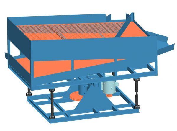 This equipment consists of a foundation bracket, a screen body, an exciting device, a transmission device, a universal joint pull rod, a feed hopper and the like, as shown in the attached figure。The screen body is hung on the big bracket through four universal joint pull rods, and the vibration exciting device is installed in the center of the screen body. The motor outside the screen body drives the vibration exciting device to rotate through the transmission mechanism, and the centrifugal force generated by the rotation of the eccentric block installed on the shaft drives the screen body to swing and shake in a plane of 360 degrees. The screen plate is installed in a structure inclined to the discharge port, and the wood chips quickly slide to the discharge port under continuous and strong shaking, thus completing the screening process of wood chips and skin dregs.。The screen body consists of a welded screen frame and a sieve plate. The upper and lower sieve plates are fixed on the screen frame by screws, and the sieve plates are inclined by 7 degrees along the discharging direction to improve the passing capacity and separation efficiency。During the rocking process of the sieve body, the wood chips slide along the surface of the sieve plate and move down. The qualified wood chips fall on the lower sieve plate through the sieve holes of the upper sieve plate, and finally are discharged from the qualified sheet discharge port. The broken chips fall on the bottom plate of the sieve body through the sieve holes of the upper and lower sieve plates, and finally are discharged from the broken outlet. The large strips that can't pass through the upper sieve holes move down along the surface of the upper sieve plate to the outlet of the large pieces to be discharged.