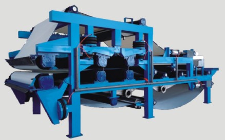 該設備的工作原理是:需要脫水的漿料經過泵或者自流到雙網壓濾機的下網帶脫水面上,平布到壓濾網上,先經過重力脫水區,也可以配有真空吸水箱輔助加快脫水。再進入夾角預脫水區,利用雙網張緊力夾住漿料預脫水。逐步前進到壓輥包繞網帶張緊脫水區,環繞第一個脫水輥時網帶產生的張緊力對原料進行初步擠壓脫水,按照第一個脫水輥的脫水方式進行第二次擠壓脫水,輥徑逐漸變小,由于脫水壓力P= 網張力F 脫水輥半徑R ,所以第二個脫水輥上的漿料受到了更大的擠壓力,依次類推。再到主壓強制加壓脫水區,利用獨立的氣胎加壓方式使壓榨輥的線壓力加強,在壓榨輥的高線壓壓力下使漿料的干度達到35%以上。