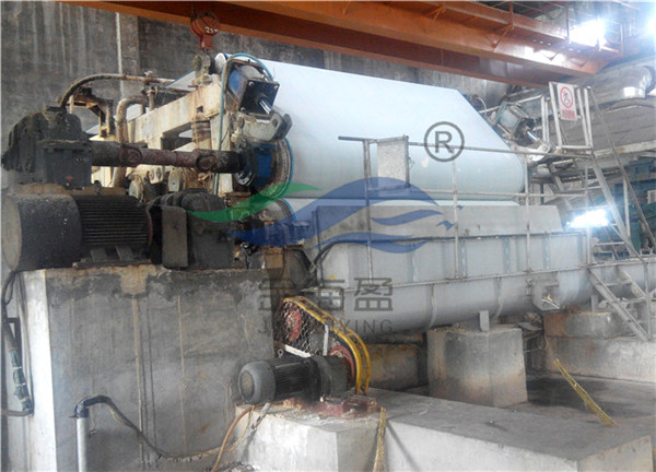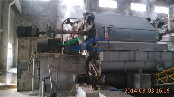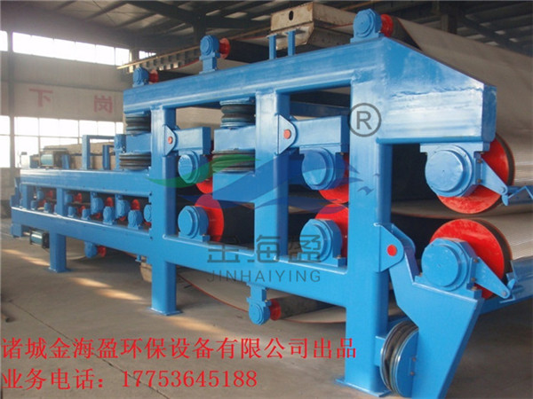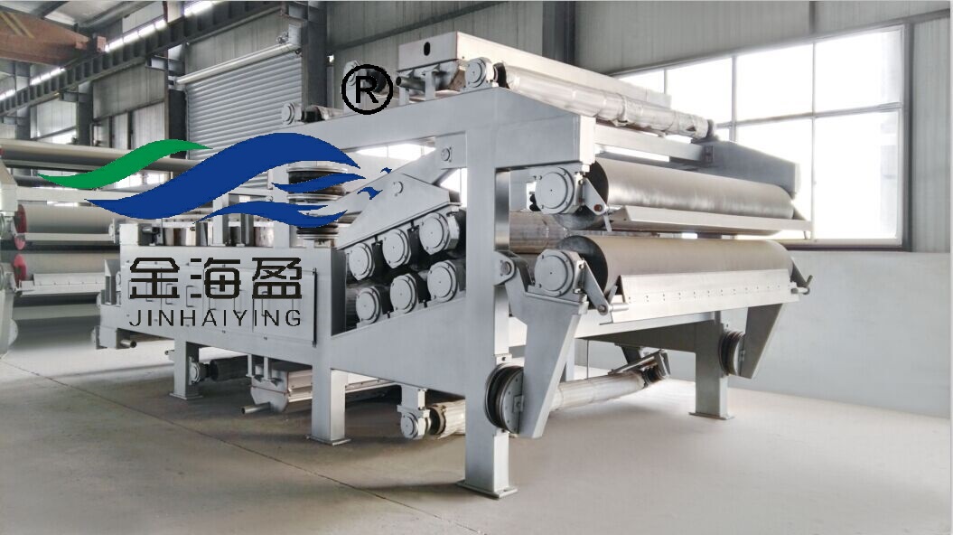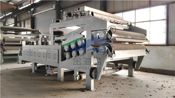 該設備的工作原理是:需要脫水的漿料經過泵或者自流到雙網壓濾機的下網帶脫水面上,平布到壓濾網上,先經過重力脫水區,也可以配有真空吸水箱輔助加快脫水。再進入夾角預脫水區,利用雙網張緊力夾住漿料預脫水。逐步前進到壓輥包繞網帶張緊脫水區,環繞一個脫水輥時網帶產生的張緊力對原料進行初步擠壓脫水,按照一個脫水輥的脫水方式進行二次擠壓脫水,輥徑逐漸變小,由于脫水壓力P= 網張力F 脫水輥半徑R ,所以二個脫水輥上的漿料受到了更大的擠壓力,依次類推。再到主壓強制加壓脫水區,利用獨立的氣胎加壓方式使壓榨輥的線壓力加強,在壓榨輥的高線壓壓力下使漿料的干度達到35%以上。
